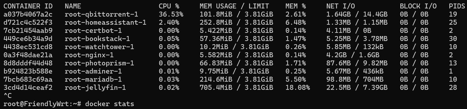 Note: docker stats shows CPU usage per core, so it's 4x100% = 400%. Like when you index photos with Photoprism, the CPU usage might say something like 271%. And in the image above qBittorrent is using of 36.53 of 400%.